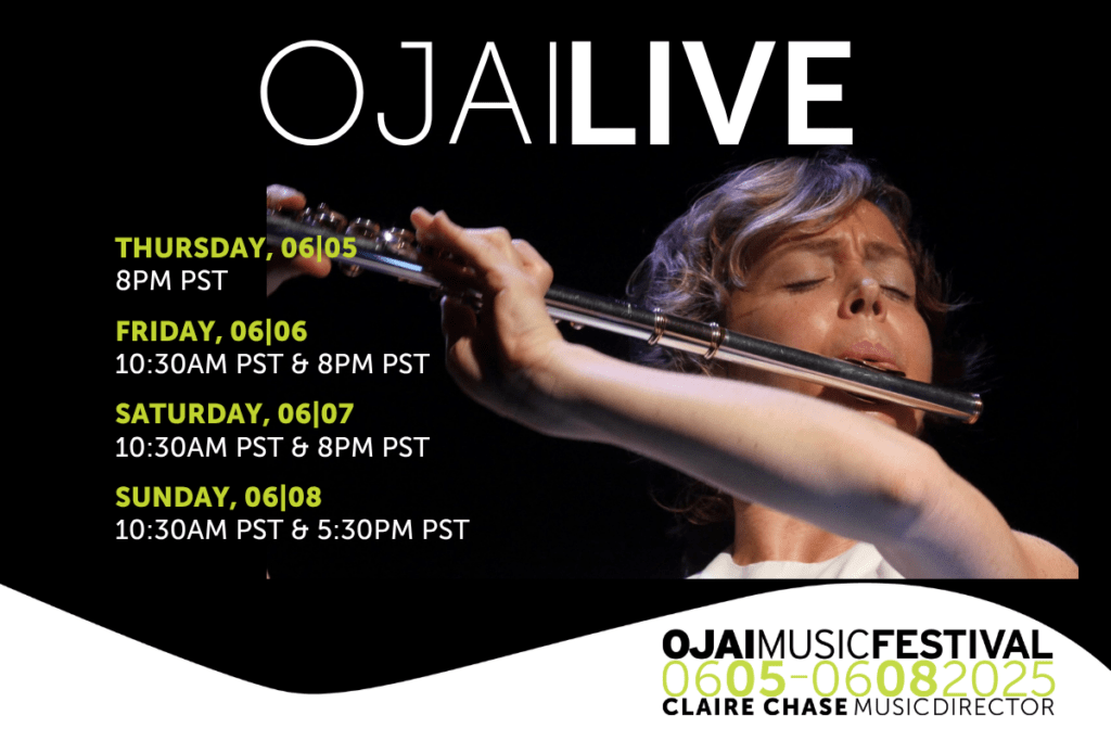 The 79th Ojai Music Festival, June 5 to 8, 2025, welcomes as Music Director acclaimed flutist Claire Chase. Seven of the more than 20 music events scheduled throughout the beautiful setting of the Ojai Valley will be available at no-cost via live streaming. Since 2012, the Ojai Music Festival has expanded its global footprint building a worldwide audience with free Live Streaming Broadcasts.
