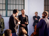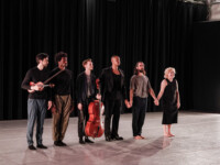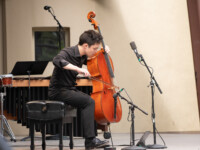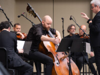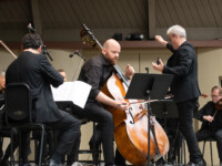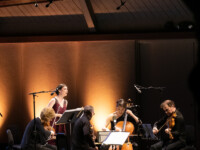 2025OjaiMusicFestival SAT 6-7-25 800pm_Jack Quartet, Kathryn Schulmeister double bass and Alex Peh harpsichord perform Meditation on the Bach chorale Vor deinen Thron, BWV 668 by SOFIA GUBAIDULINA_credit Timothy Teague (DSC_8372)